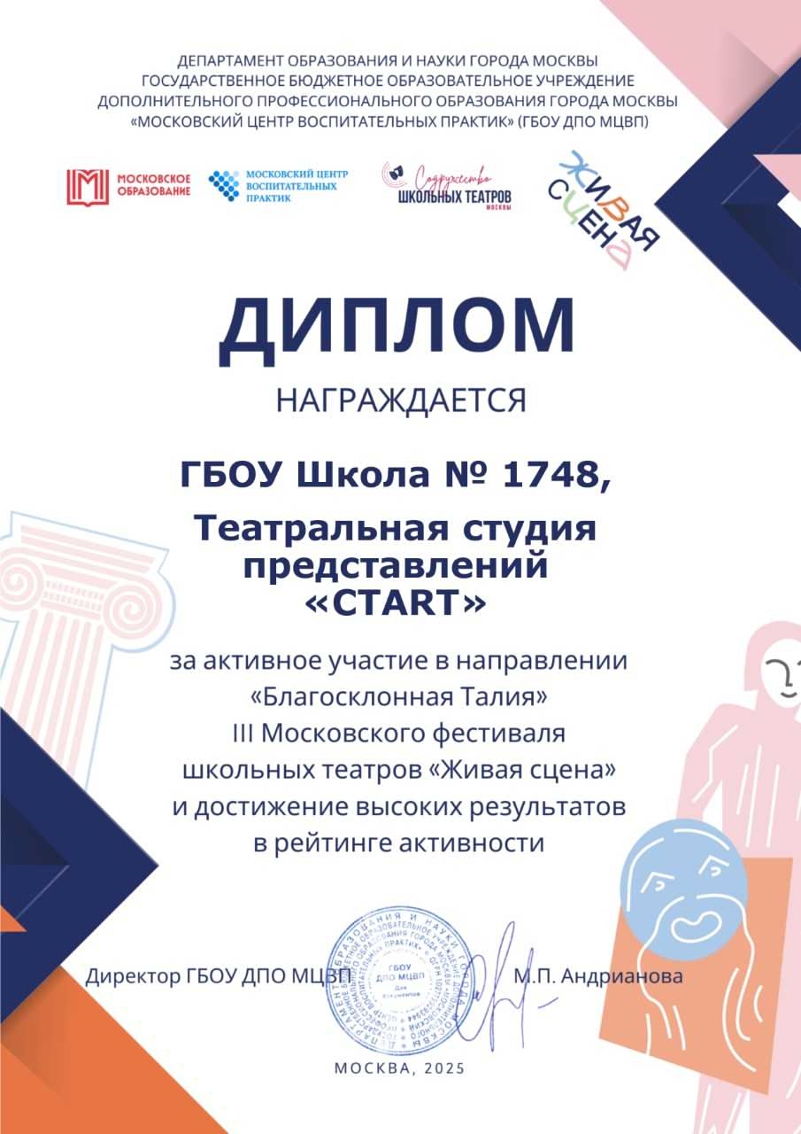 Были подведены итоги прошлого сезона и определены 100 лучших школьных театров столицы. Театральная студия представлений "СТART" школы № 1748 "Вертикаль" под руководством педагога дополнительного образования Михаила Владимировича Рогулова вошла в эти 100 лучших!